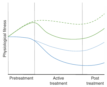多項研究證實,運動是癌症治療的最佳處方!圖表依序呈現治療前、中、後的體能變化: